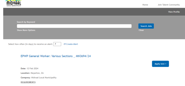 -Grade 10. -Grade 12 (added advantage). -Valid Driver’s License (added advantage). -Excellent interpersonal & communication skills (must be bilingual). – Applicants that reside within the Midvaal area will be given preference – Ability to follow & execute given instructions. -Good physical health, basic skill & know how of doing physical work. – Must meet operational requirements of the post -A hard-working self-disciplined person. -01 year relevant experience in general worker within an Engineering and/or Roads Section (Water, Purification, Sewer, Roads, Electrical) within Local Government Authority will be an added advantage.